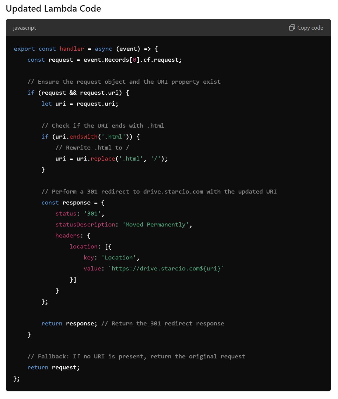 We knew we could configure a better redirect on AWS, but we weren’t sure whether to use S3, CloudFront, or another AWS service. We fed ChatGPT the technical requirements, and it recommended using CloudFront with an AWS Lambda function to handle rewriting the URLs.